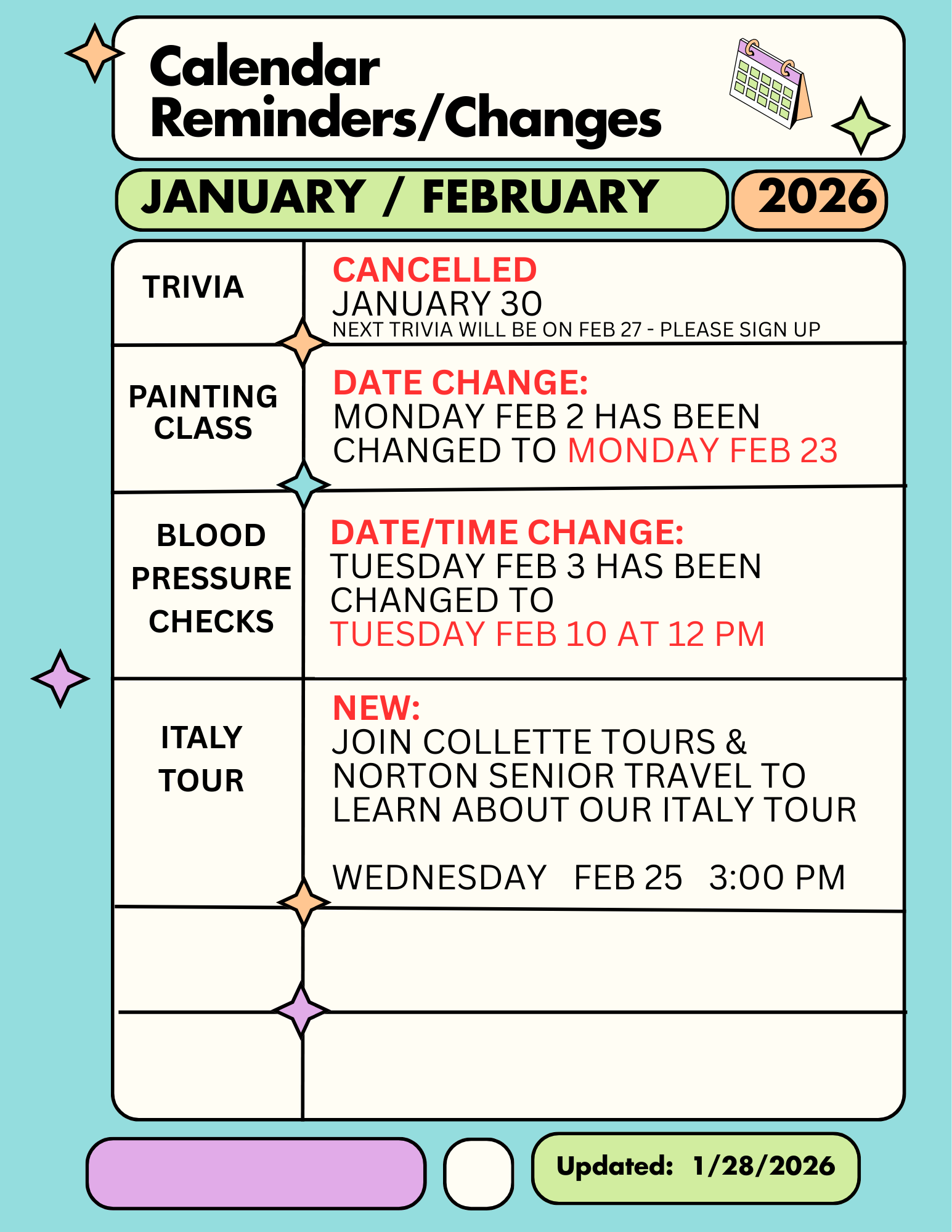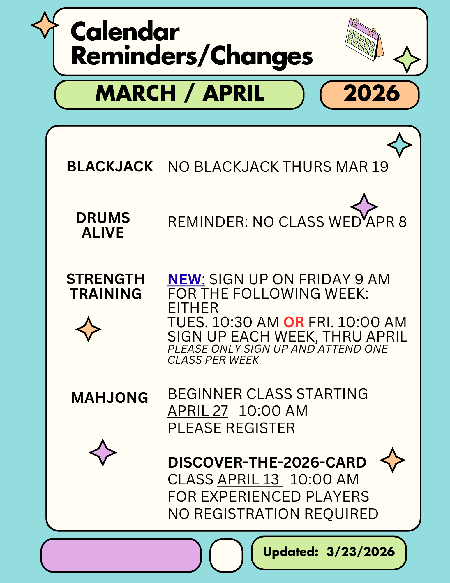 changes to Weekly Classes and other  events